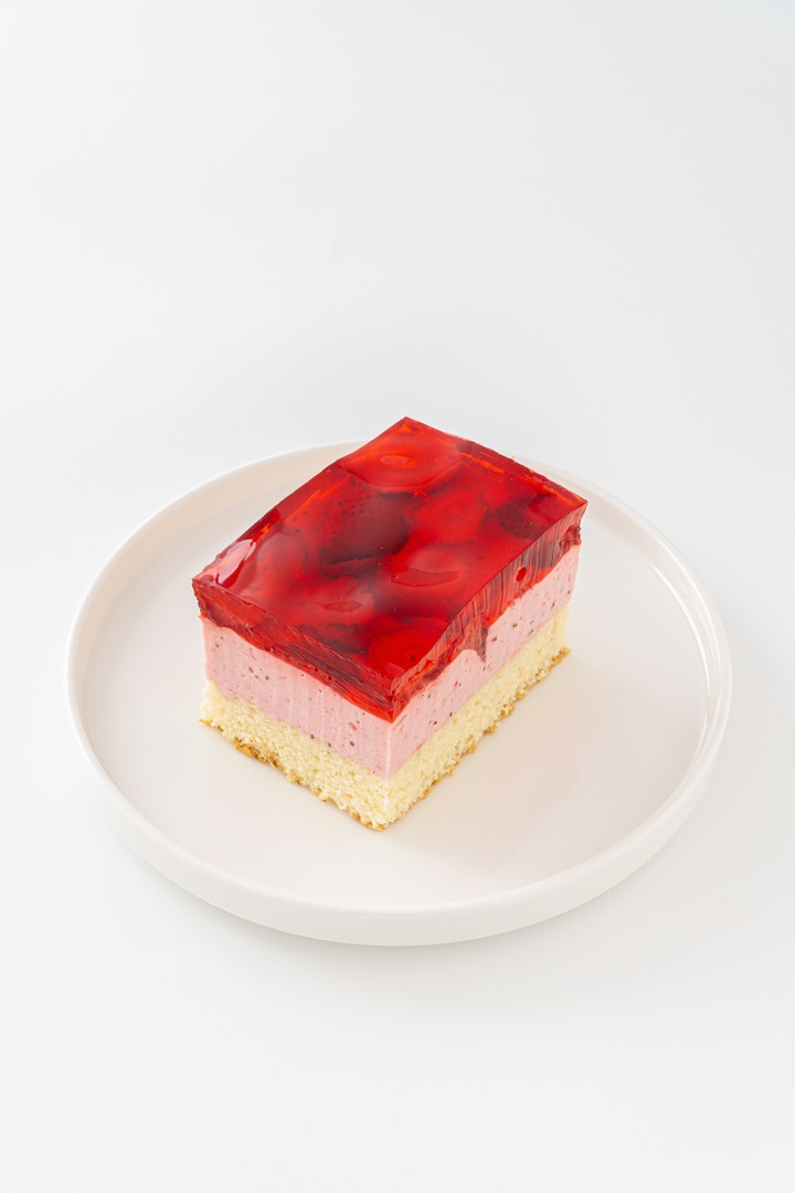 Nasze delikatne ciasto biszkoptowe z masą na bazie bitej śmietany z owocową galaretką to prawdziwa rozkosz dla podniebienia. Jego lekkość i kremowa konsystencja zapewniają doświadczenie delikatnego smaku. Całość jest pięknie udekorowana truskawkową oraz galaretką, która nadaje mu niepowtarzalny wygląd i smak.