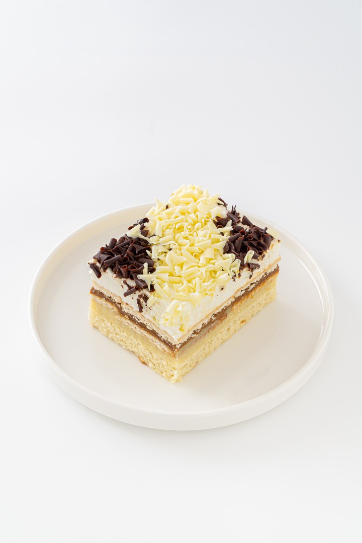 Jasny biszkopt z delikatną masą budyniową, chrupiącymi herbatnikami, karmelem, migdałami, lekką bitą śmietaną. Całość jest wykończona wiórkami czekoladowymi i stanowi połączenie smaku karmelu, chrupkości migdałów i świeżości bitej śmietany, które dostarcza niezapomnianych doznań smakowych.