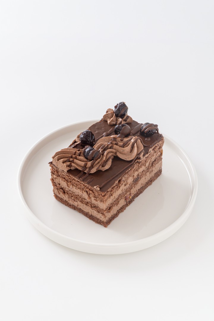 Nasączony czekoladowy biszkopt, przełożony czekoladową bitą śmietaną z dodatkiem wiśni w czekoladzie. To ciasto, które łączy bogactwo czekolady z owocowym akcentem wiśni, dostarczając niezapomnianych doznań smakowych.