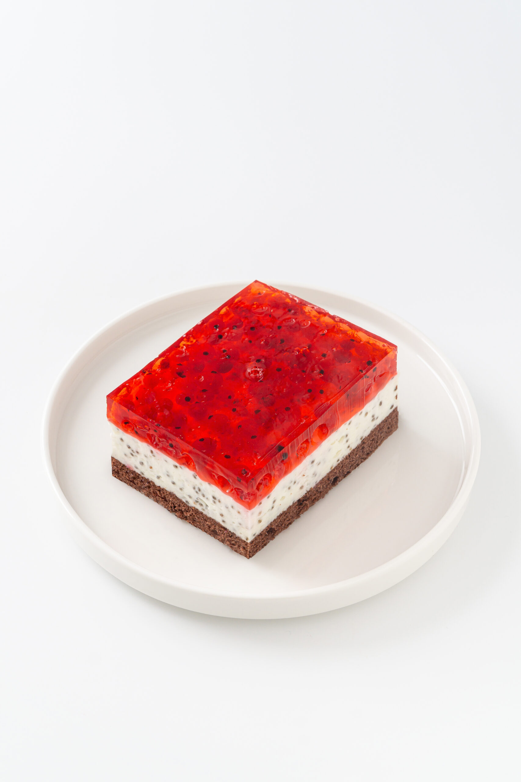 Delikatne, ciemne ciasto biszkoptowe, przełożone kremową masą z połączenia słodkiej śmietany, wyrazistego jogurtu greckiego i zdrowych nasion chia. Całość przykryta jest warstwą soczystej czerwonej porzeczki, a na wierzchu połyskuje delikatna, owocowa galaretka.
