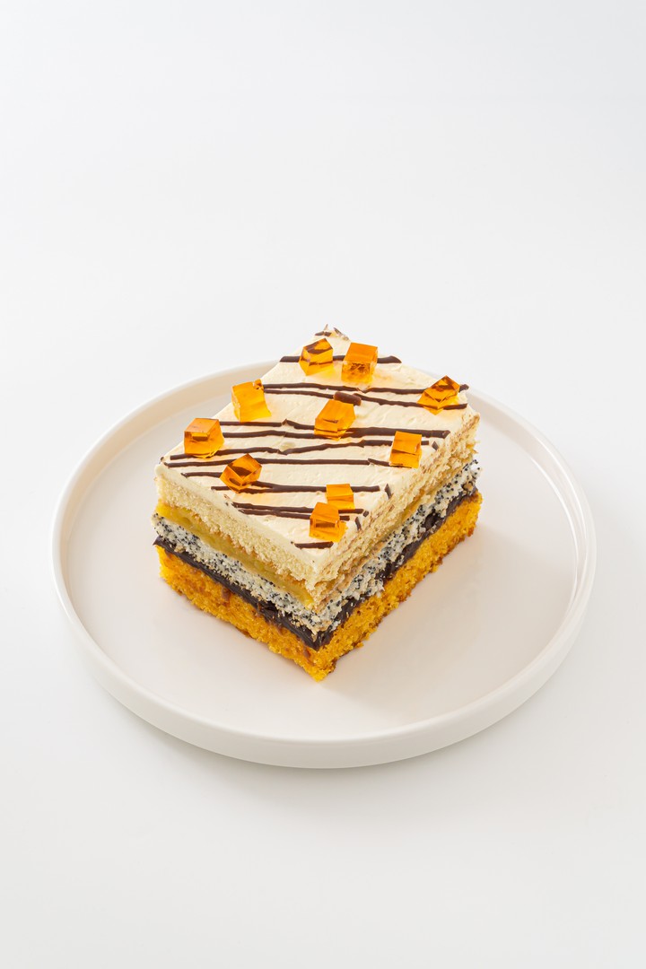 Ciasto pomarańczowe z kremem czekoladowo-pomarańczowym, przełożone biszkoptem makowym, nadzieniem pomarańczowym, kremem waniliowym z polewą czekoladową i pomarańczową galaretką. To wyjątkowe ciasto, które łączy w sobie świeżość pomarańczy z intensywnością czekolady i delikatnością kremu waniliowego. Całość jest wykończona pomarańczową galaretką, dodając ciastu owocowej słodyczy i wyjątkowego smaku.