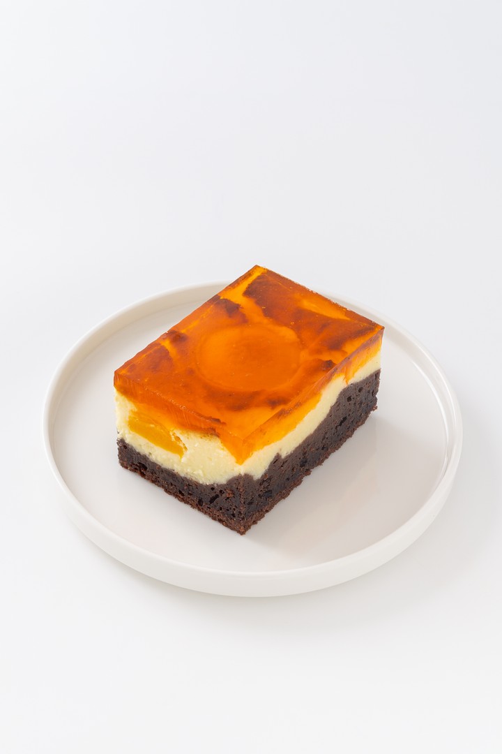 Całość jest wykończona soczystymi kawałkami brzoskwiń, które zostały zalane delikatną galaretką owocową.